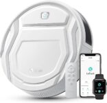 Controlled via a smart app with adjustable suction and cleaning modes, compatible with Google Assistant and Alexa voice commands; lacks an internal water tank for mopping.