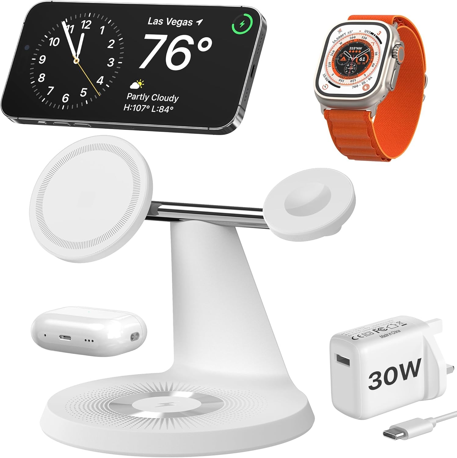 Design: Modern magnetic stand with solid build.Compatibility: iPhone MagSafe, AirPods, Apple Watch.